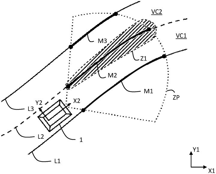The method (P1) for detecting a boundary (L1, L2, L3) of a traffic lane (VC1, VC2) for a motor vehicle (1) involves detecting the boundary by a vehicle environment detection means, the boundary being defined by a function (typically polynomial), determining a plurality of first vectors characterizing the boundary based on map data and vehicle pose, determining a plurality of second vectors characterizing the boundary through orthogonal projection onto said function, and calculating Mahalanobis distances between each first and second vector.